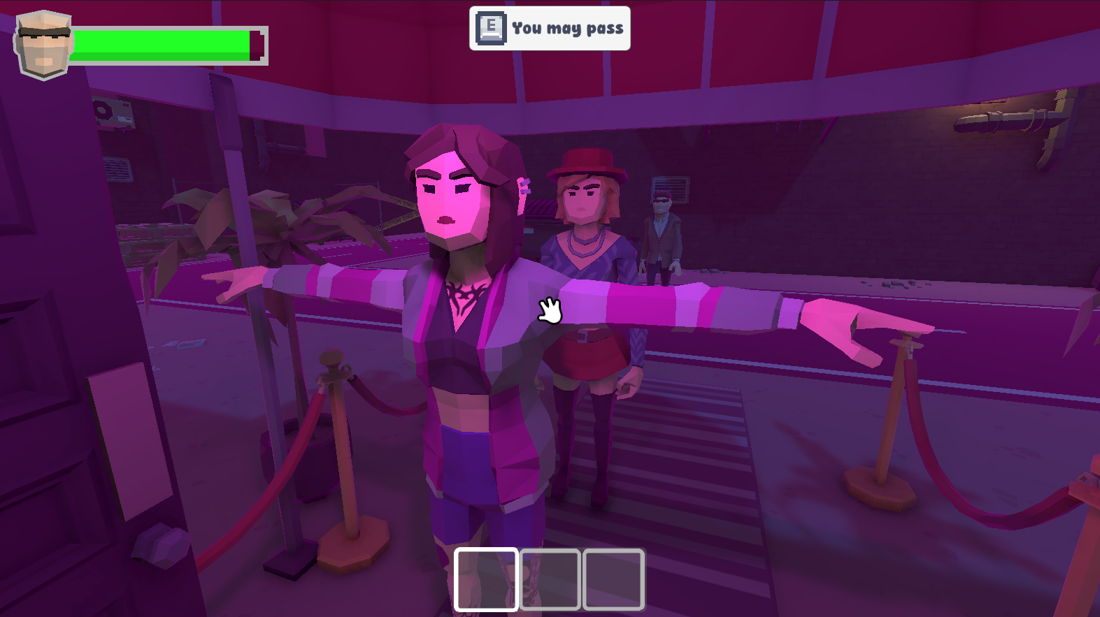 Pat-Down is a game in which you, well... Pat Down partygoers coming to the nightclub. Your security boss is in a bad mood, so we have to keep him happy by finding contraband on the customers. Don't forget to hand over whatever you find to your boss as the bar. Better be quick about it, since his mood will decrease the longer the night goes on! How long can you last before you inevitably get fired?